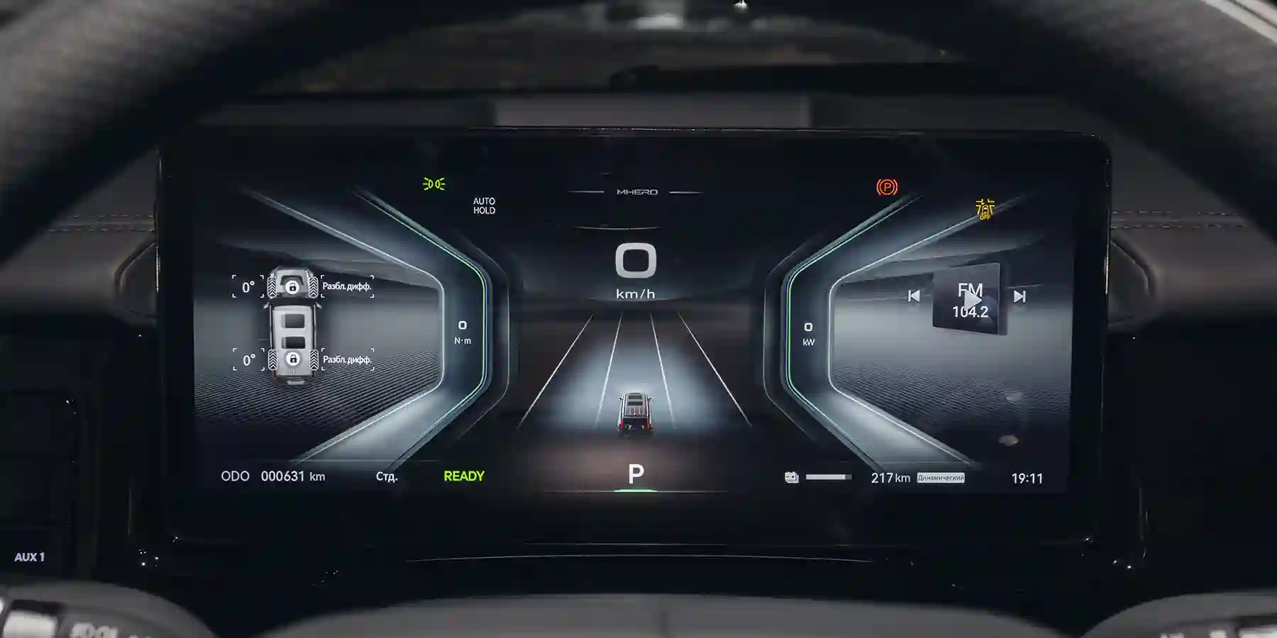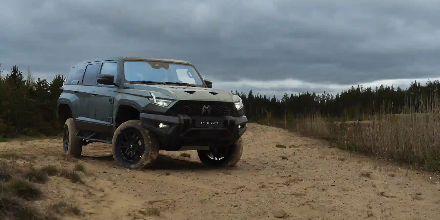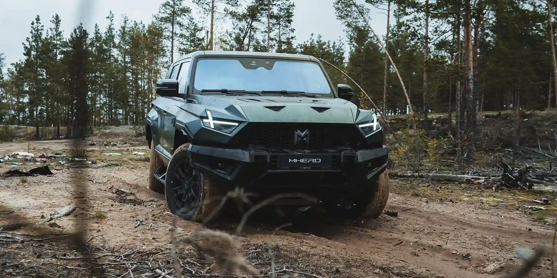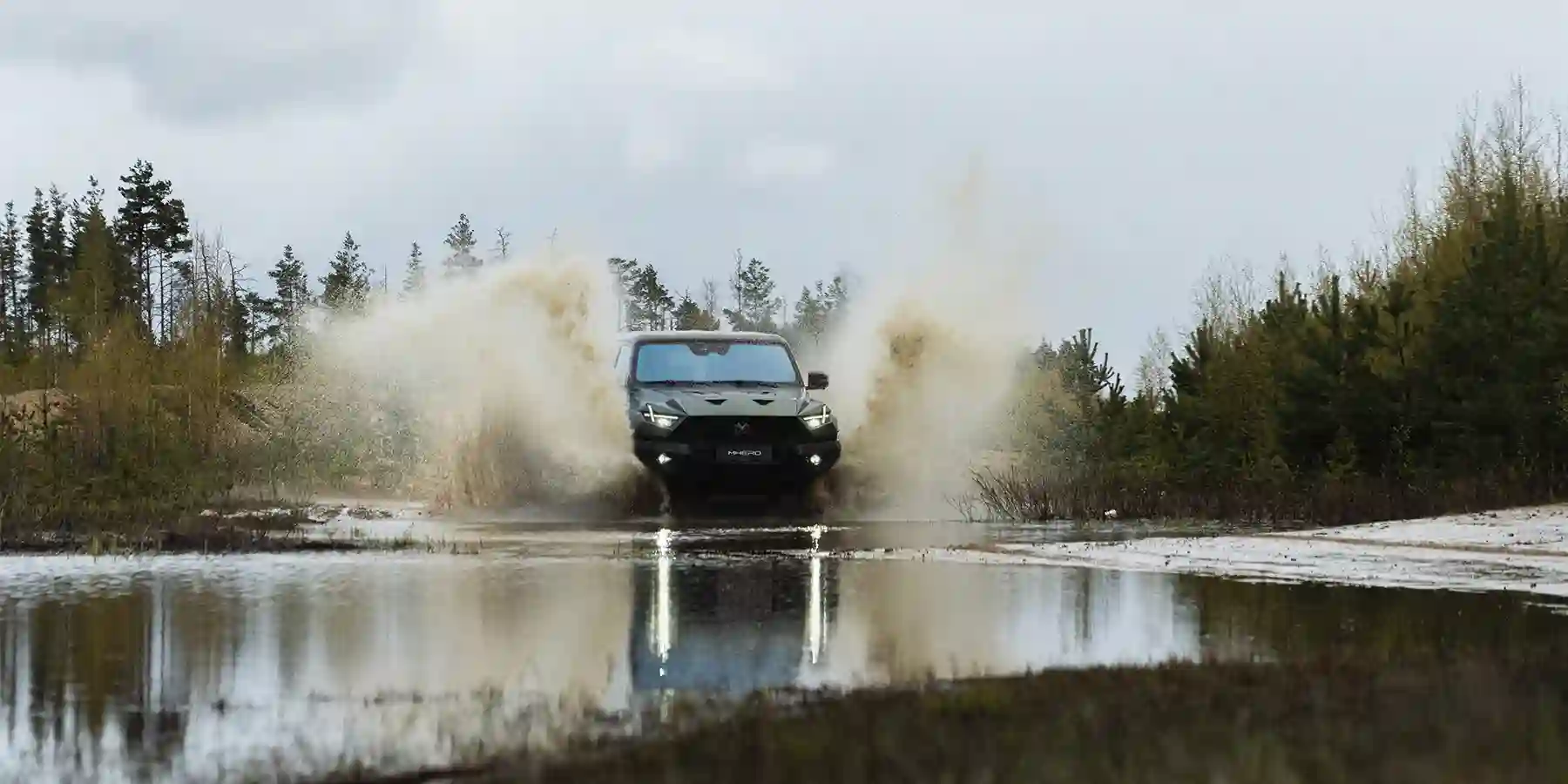 MHERO показал себя просто по-геройски. Во-первых, он был ангельски тих: электромоторы не давали о себе знать ни шумом, ни вибрацией, а ДВС ни разу не вступил в дело. Но главное, мне очень понравилось, как «Воин» едет: подвеска скрадывает все дорожные неприятности, позволяя почти не замечать «лежачих полицейских», и при этом машина прекрасно держит траекторию в поворотах. На высоких скоростях она волшебным (точнее, пневматическим) образом припадает к земле на 45 мм, в результате высокий рамный вездеход весом в три с лишним тонны проходит виражи лучше, точнее и с меньшими кренами, чем большинство городских китайских «паркетников». Особенное удовольствие доставила езда по проселкам. Никакие ямы, кочки, рытвины, гребенка «М-Герою» не страшны, он проходит их на ура — главное, чтобы ваш пассажир не пугался и покрепче держался за массивный поручень на передней стойке. Такой замечательный характер обусловлен конструкцией подвески. Независимая, на параллельных треугольных рычагах не только спереди, но и сзади, где у прочих рамных вседорожников находится неразрезной мост, она обеспечивает недостижимую для конкурентов управляемость. И, разумеется, замечательную проходимость. Кроме привода на все колеса, понижающего ряда передач, могучего крутящего момента в 1050 Нм, большого хода подвески и блокировок межколесных дифференциалов на вооружении MHERO — пневмосистема, с помощью которой можно увеличивать клиренс со стандартных 221 до 326 мм. Глубина брода при этом достигает 900 мм, а углы въезда и съезда увеличиваются с 31 до 36,8° и 37,5° соответственно. Мало того, задние колеса машины сделаны управляемыми. На скоростях до 20 км/ч «М-Герой» поворачивает их на 10,6 градуса в сторону, противоположную передним, облегчая водителю развороты. Но можно принудительно поворачивать их вместе с передними — такая «крабья походка» еще больше увеличивает маневренность машины и ее возможности вне асфальта.